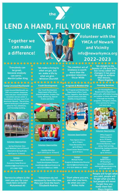 If you are interested in VOLUNTEERING please contact Fran Rieger via frieger@newarkymca.org or 973-624-8900 extension